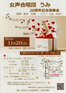 備 考|千葉県の女声合唱団うみの皆様が、20周年記念演奏会で「今日もひとつ」(組曲)を演奏して下さいます。